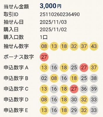 これらの数字のパターン組み合わせでかってみたら・・・6個中4個も当たってた(@_@;)